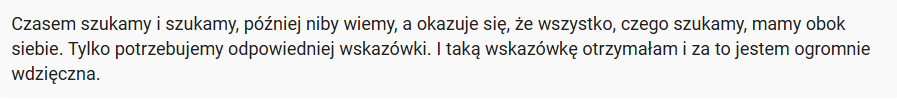 Po trzecie – najczęstszym zdaniem, jakie słyszę od kobiet, z którymi pracuję, jest: „To jest niesamowite, jak trafnie to ujęłaś”. Moje analizy nie są ogólnikami – to konkretne wglądy, które realnie zmieniają perspektywę i ułatwiają działanie. W twojej rzeczywistości, a nie w idealnym świecie.