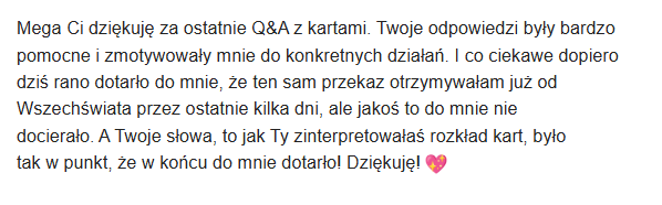 Wszystko dzieje się na dedykowanym kanale w aplikacji Telegram. To tam otrzymujesz codzienne wskazówki tekstowe i wideo. Dłuższe materiały, takie jak prognozy miesięczne czy rozkłady tematyczne, również przesyłam Ci na Telegramie w formie wygodnych linków do nagrań na YouTube. Masz więc wszystko w jednym miejscu, pod ręką w swoim telefonie.