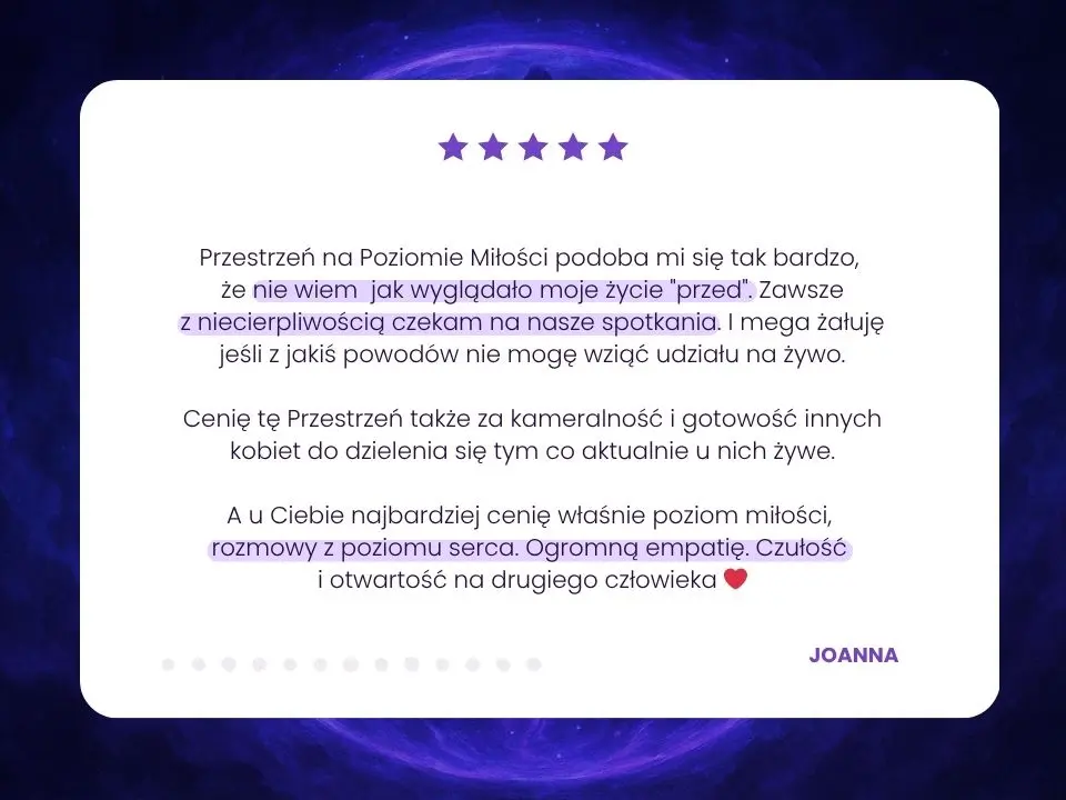 To nie jest anonimowy kurs. To intymna grupa kobiet, która tworzy bezpieczną przestrzeń do dzielenia się, bycia widzianą i otrzymywania wsparcia. To właśnie siostrzana energia i poczucie, że nie jesteś sama, daje odwagę do działania.