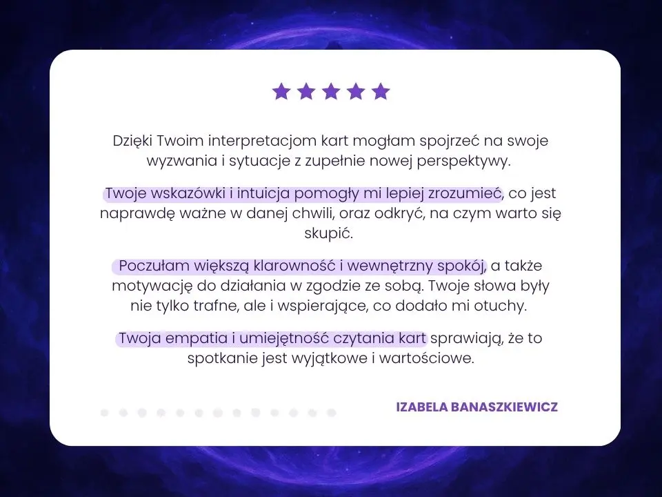 Tarot nie mówi Ci, co masz robić, ale pokazuje Twoją sytuację z tak klarownej perspektywy, że wybór staje się oczywisty.