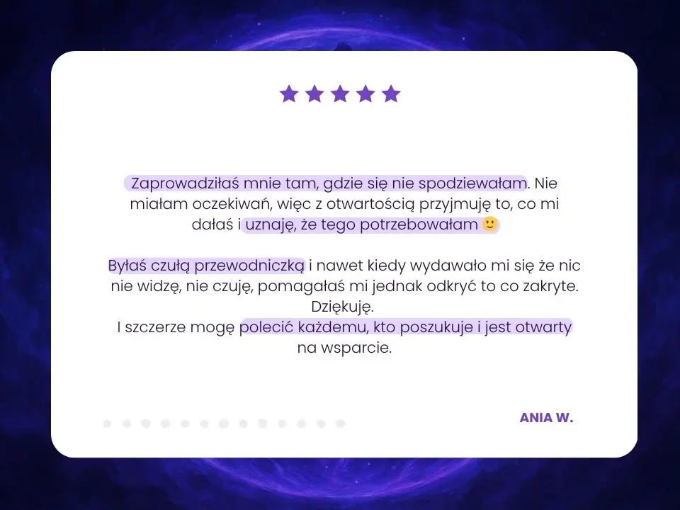 Nie jestem guru, który da Ci gotową receptę na życie. Jestem przewodniczką, która przejdzie tę drogę obok Ciebie. Moją rolą jest trzymać latarnię – oświetlać Ci ścieżkę, pokazywać narzędzia i zadawać pytania, które pomogą Ci usłyszeć Twoją własną, wewnętrzną prawdę.