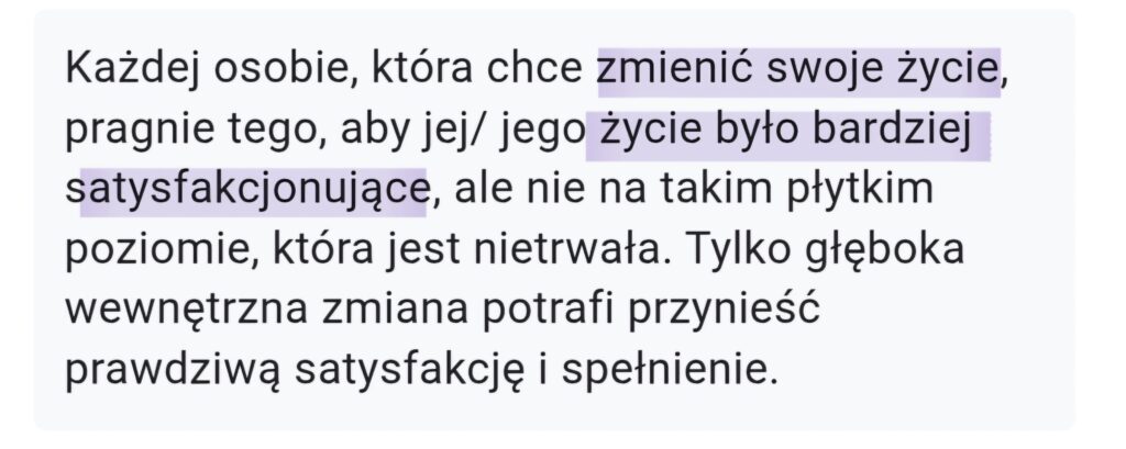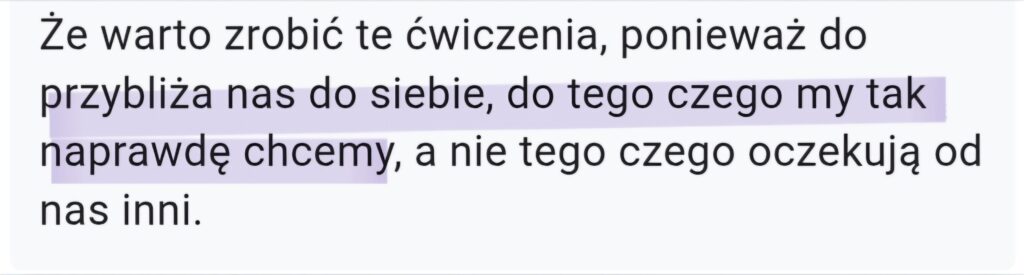 Wierzę, że jeśli Ty zaangażujesz się w ten proces, będziesz regularnie uczestniczyć w spotkaniach i wykonywać ćwiczenia, to rezultaty, po które tu przyszłaś, staną się Twoim udziałem.
